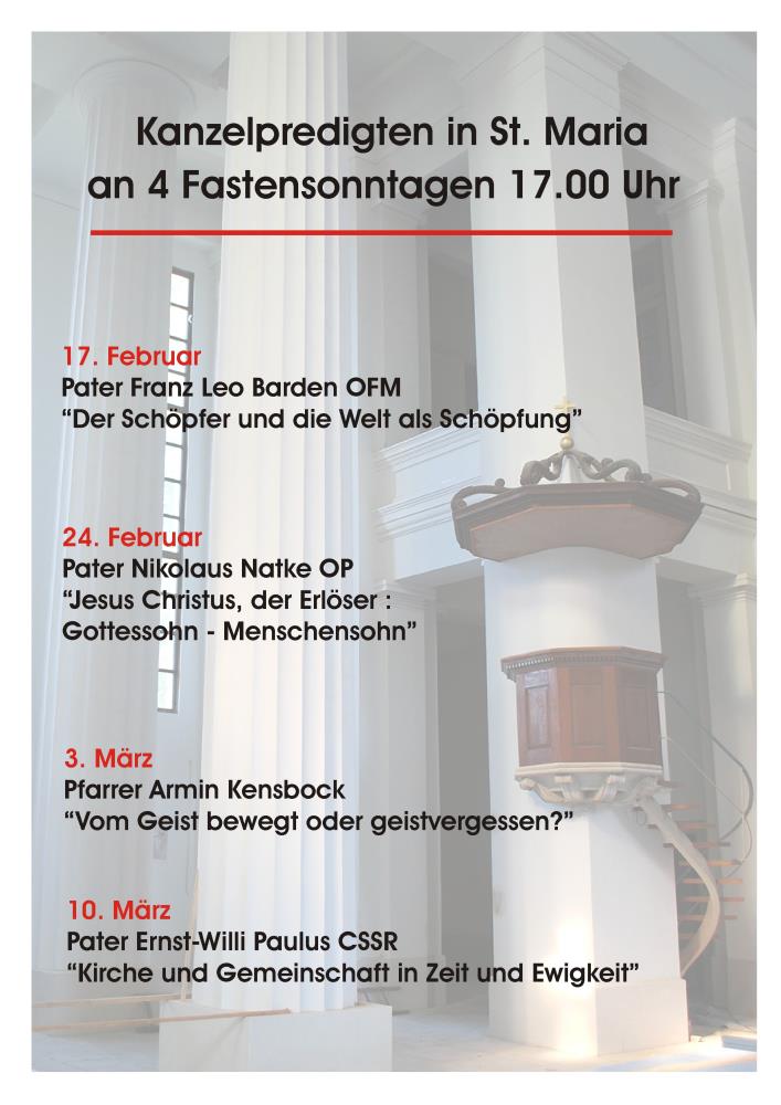 An den ersten vier Fastensonntagen wurden in der Schloss- und Pfarrkirche St. Maria Köthen jeweils um 17.00 Uhr Kanzelpredigten von Geistlichen aus der näheren und ferneren Umgebung gehalten. Inhalt der Predigten war das Glaubensbekenntnis der Kirche, das in Beziehung zur heutigen Welt gesetzt und ausgelegt wird.